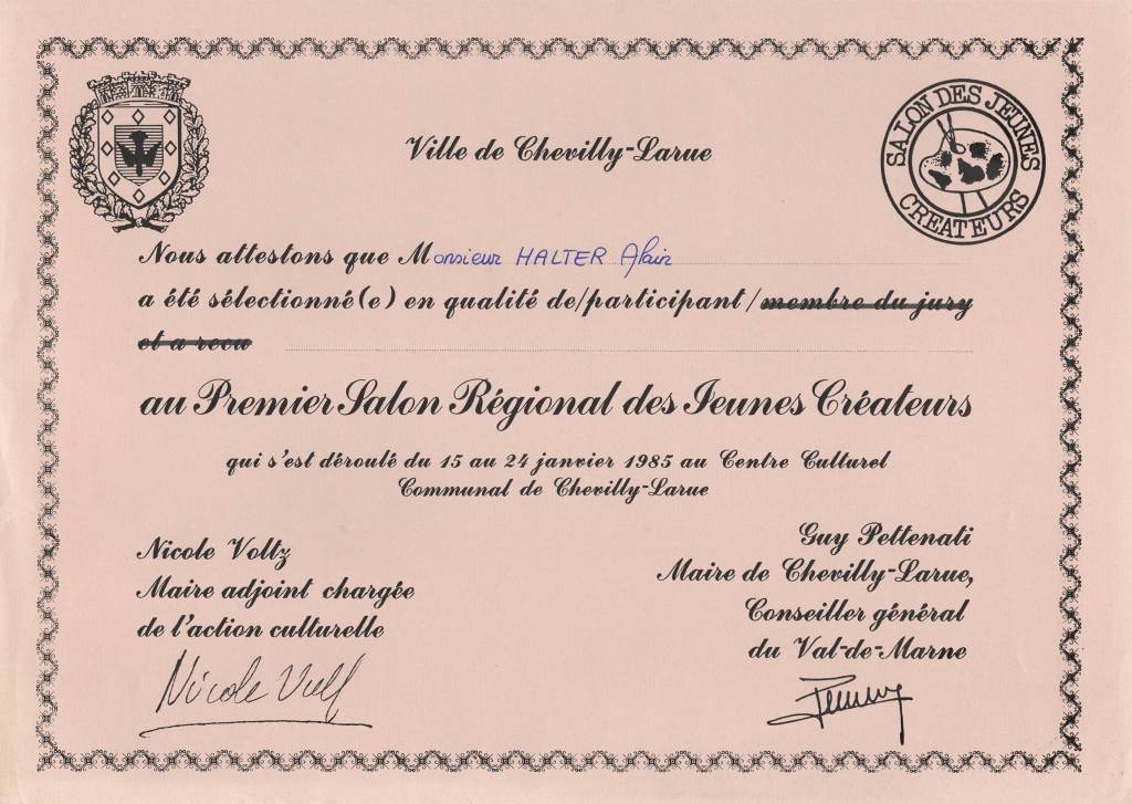 – 15-24 janvier 1985 : Premier salon régional des jeunes créateurs, Chevilly-Larue (94), France.
