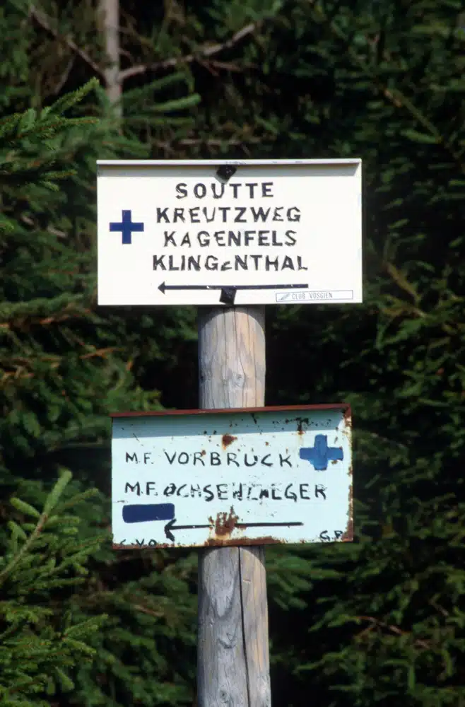 Tête des Païens, Rothlach, coul. jaune, 2 h. 1/4 Du sommet on se dirige par un chemin de piétons, large et commode, vers le SW et l’on descend en 20 min. sur le col, où débouchent les deux sentiers réunis décrits sous b) et c). Du Col de la Tête des Païens, tout droit vers le SW, on gagne par la route forestière en 5 min. la maison forestière Ochsenlaeger ; ici on continue tout droit dans la direction du SW par la large route forestière, dans une belle forêt. A dr. on est dominé par le rocher porphyrique Steinhubel (890 m, vue masquée par les arbres) ; le chemin atteint une jeune plantation. Vue sur Ste-Odile. Après 1 h. 1/4 sur le Dielenplatz (839 m), qui ferme la vallée de l’Ehn. Au milieu de la clairière s’élève un sapin imposant appelé Judentanne. Bifurcation du chemin : à g., on va sur le pré où se trouvait la maison forestière Sutt, maintenant démolie”…